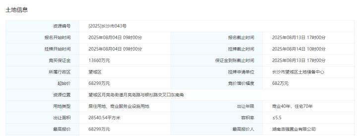 8月14日,[2025]长沙市043号地块迎来出让,地块起始价68299万,容积率≤5.5,限高200米。最终,该地块被润和城旗下的湖南洛强置业有限公司摘得,成交楼面价4351元/㎡。