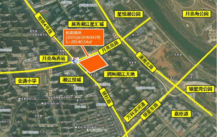 043号地块出让面积为28540.54平方米,规划用途为商住用地,商住比为1:9。地块位于望城区月亮岛街道月亮岛路与银杉路交叉口东南角,紧邻地铁4号线月亮岛西站。地块西侧一街之隔就是龙湖天街,周边有长郡双语白石湖实验中学、师大附中星城实验中学一小等教育资源,整体配套十分丰富。